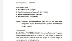 BERNANDO Sinaga dan Matilda Juni Asrida Sinaga, warga Jalan Pengairan No 79, Kelurahan Aek Nauli, Kecamatan Siantar Selatan, Kota Pematangsiantar – atas nama seluruh terbanding/penggugat – tertanggal 18 Mei 2022 mengirimkan surat kepada Mahkamah Agung RI, Wakil Mahkamah Agung Non Yudisial, Ketua Kamar Pembinaan Mahkamah Agung, Panitera Mahkamah Agung, Kepala Bawas Mahkamah Agung dan Ketua … Lanjutkan membaca Di PN Pematangsiantar putusan BHT dikasasi, Bernando Sinaga: “Kami sudah lelah YANG MULIA”