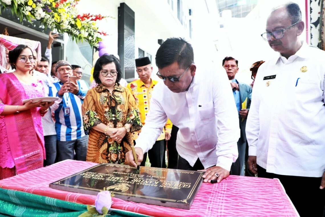 Peresmian kantor camat yang dirangkai dengan syukuran tahun baru 2024, juga ditandai dengan penandatanganan prasasti oleh Bupati didampingi Wakil Bupati, Forkopimda, dan ketua TP PKK, Ratnawati Radiapoh Hasiholan Sinaga.