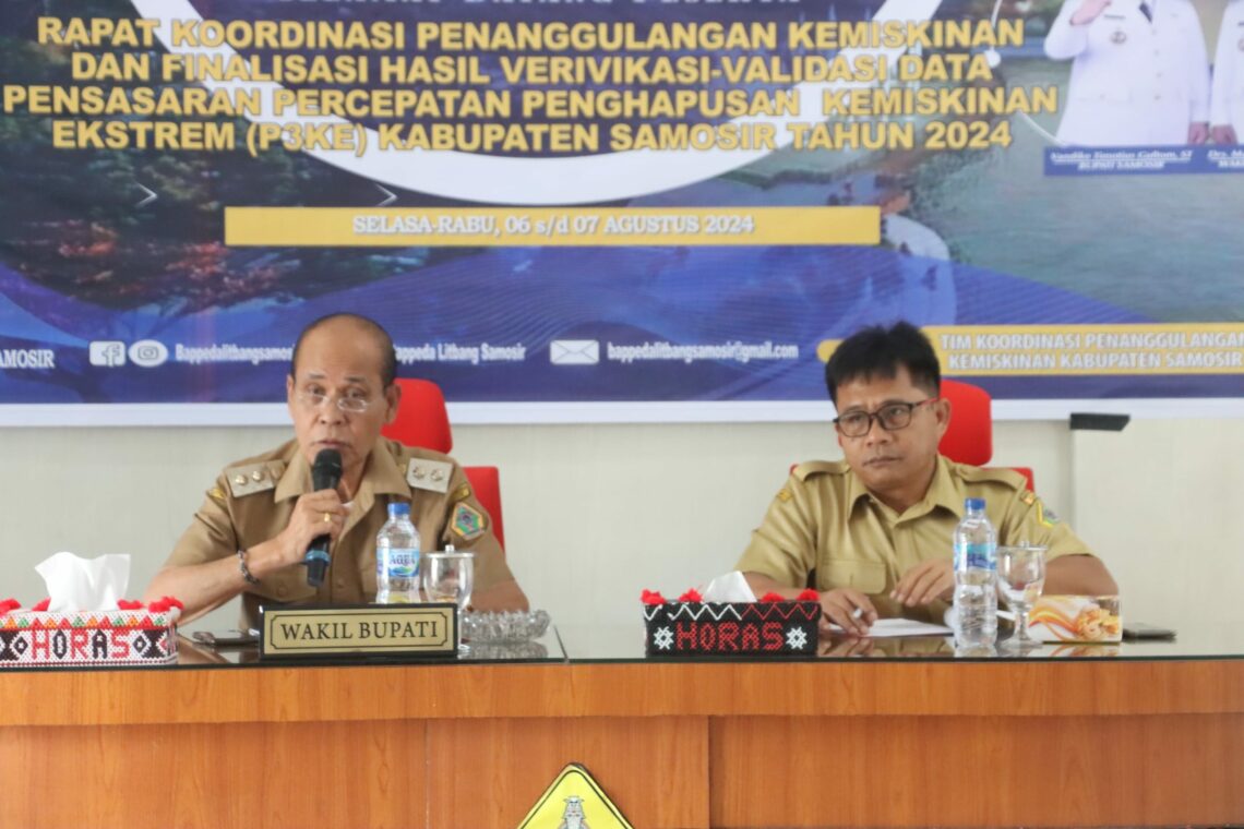 SAMOSIR – SEGARIS.CO – Wakil Bupati Samosir, Martua Sitanggang, memimpin Rapat Koordinasi Penanggulangan Kemiskinan dan Desk Verifikasi Validasi Data P3KE di Aula Kantor Bupati Samosir pada Selasa (06/08/2024).