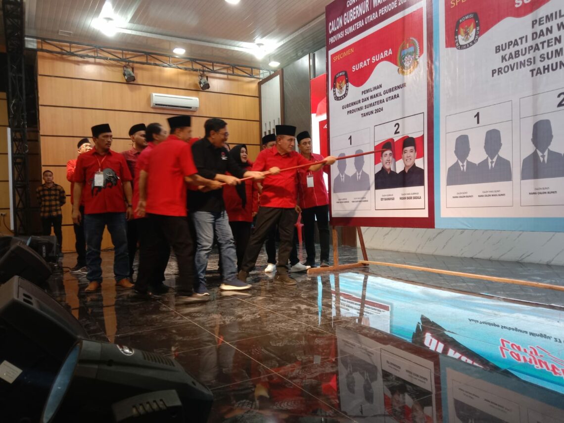 Kemudian, Cagubsu/Wagubsu Edy – Hasan bersama Cabup/Cawabup Batubara Zahir – Aslam memperagakan tata cara pencoblosan yang tepat.
