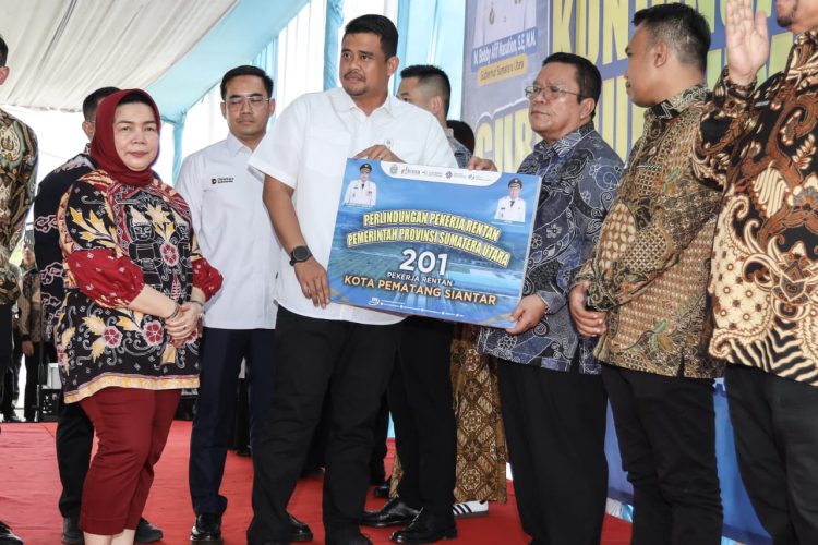 SIMALUNGUN – SEGARIS.CO — Gubernur Sumatera Utara (Sumut) Muhammad Bobby Nasution menyerahkan secara simbolis Kartu BPJS Ketenagakerjaan bagi pekerja rentan di sela Kunjungan Kerja (Kunker) di Kawasan Ekonomi Khusus (KEK) Sei Mangkei, Nagori Sei Mangkei, Kecamatan Bosar Maligas, Kabupaten Simalungun, Kamis (9/10/2025).