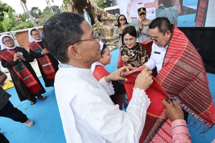 Usai menyampaikan sambutan, Wesly bersama Liswati menerima ulosi dari Mgr Kornelius Sipayung sebagai tanda berkat dan penghormatan, diikuti oleh Kapolres dan unsur Forkopimda lainnya.