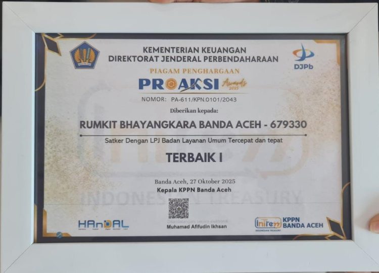 “Rumkit Bhayangkara meraih peringkat pertama Penghargaan Proaksi Triwulan III Tahun 2025 dari KPPN Banda Aceh untuk kategori BLU dengan laporan pertanggungjawaban tercepat dan tepat se-Provinsi Aceh.