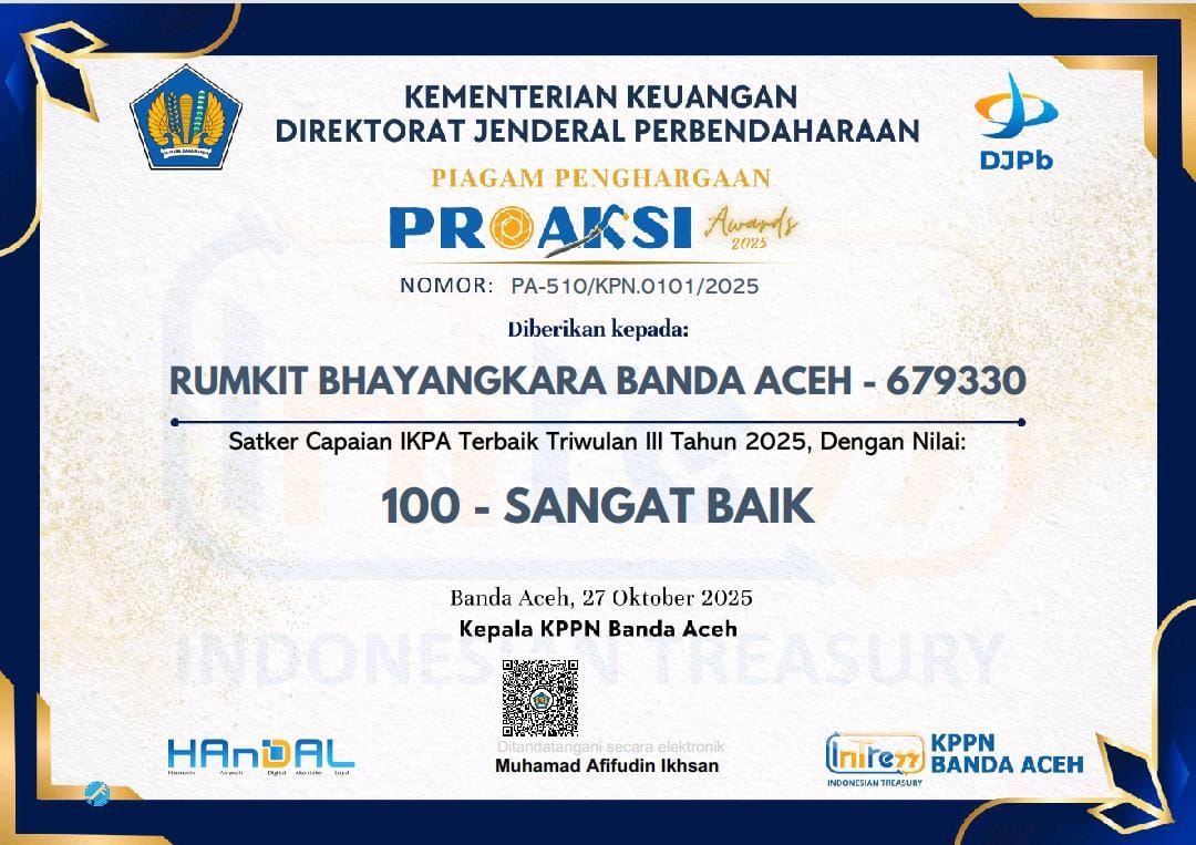 “Rumkit Bhayangkara meraih peringkat pertama Penghargaan Proaksi Triwulan III Tahun 2025 dari KPPN Banda Aceh untuk kategori BLU dengan laporan pertanggungjawaban tercepat dan tepat se-Provinsi Aceh.