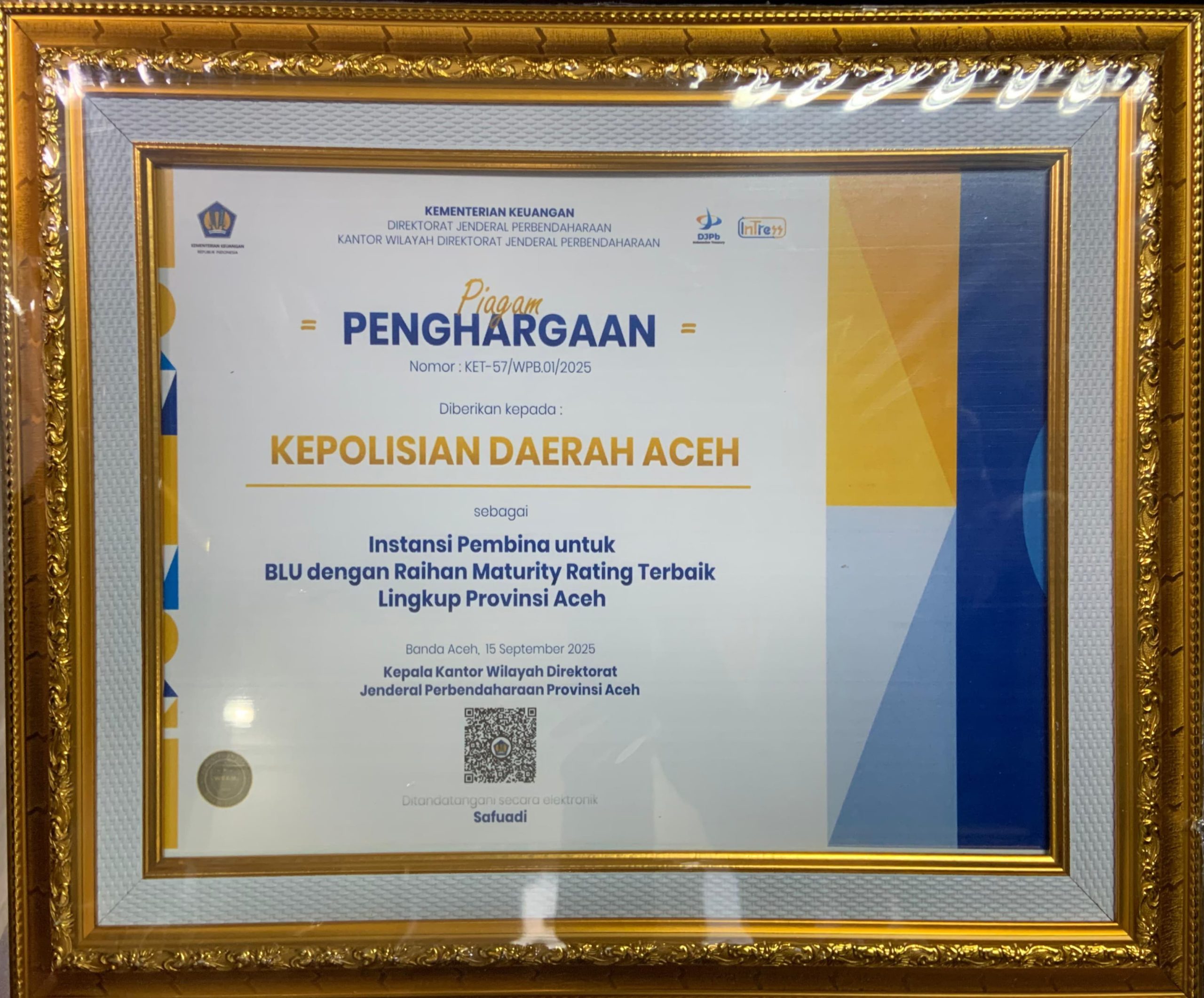 Penghargaan tersebut meliputi Proaksi Triwulan III Tahun 2025 dari KPPN Banda Aceh, Maturity Rating Terbaik Pengelolaan BLU dari Kanwil Direktorat Jenderal Perbendaharaan (DJPb) Provinsi Aceh, serta Satker dengan Capaian IKPA Terbaik 100% Triwulan III Tahun 2025.
