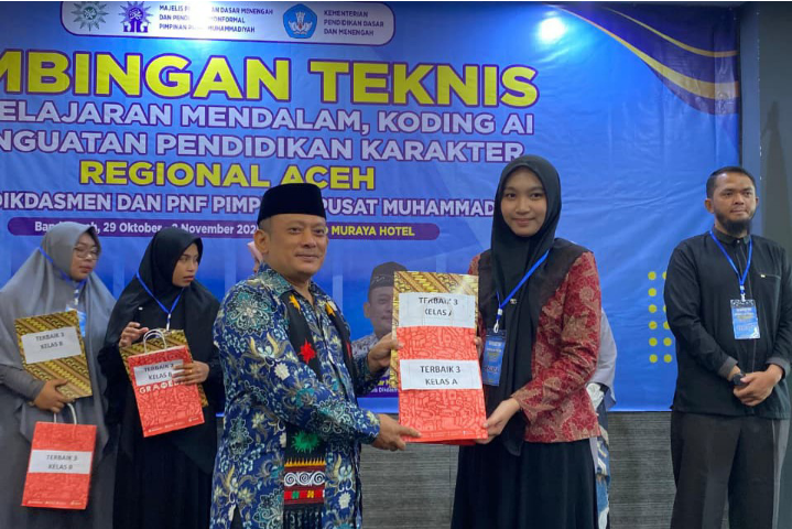BANDA ACEH – SEGARIS.CO — KEGIATAN Bimbingan Teknis (Bimtek) Pembelajaran Mendalam, Koding Artificial Intelligence (AI), dan Penguatan Pendidikan Karakter Regional Aceh yang diselenggarakan Majelis Dikdasmen dan Pendidikan Nonformal (PNF) Pimpinan Pusat Muhammadiyah bekerja sama dengan Kementerian Pendidikan Direktorat Sekolah Dasar Republik Indonesia, resmi ditutup pada Ahad (2/11/2025) di Hall Kyriad Muraya Hotel, Banda Aceh.