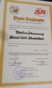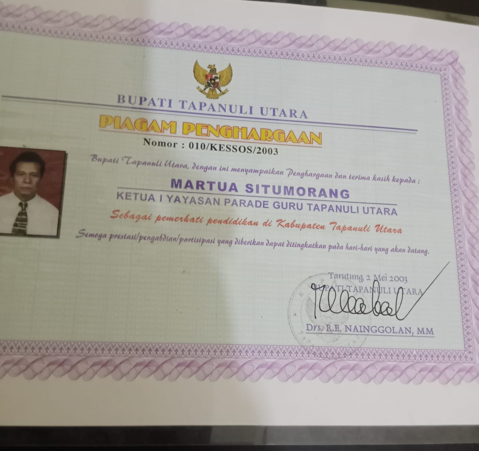 Dan saya 2 kali menerima piagam penghargaan sebagai pemerhati pendikan di waktu Perayaan HUT Proklamasi Kemerdekaan RI dan di Hari Pendidikan Nasional.