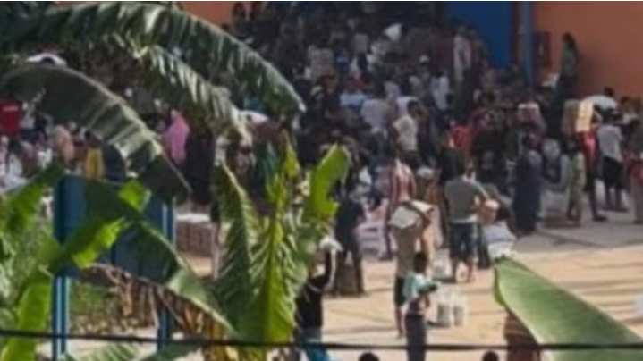 Dalam rekaman tersebut, sekelompok warga terlihat mendobrak fasilitas gudang dan membawa keluar berbagai komoditas pangan seperti beras dan minyak goreng.